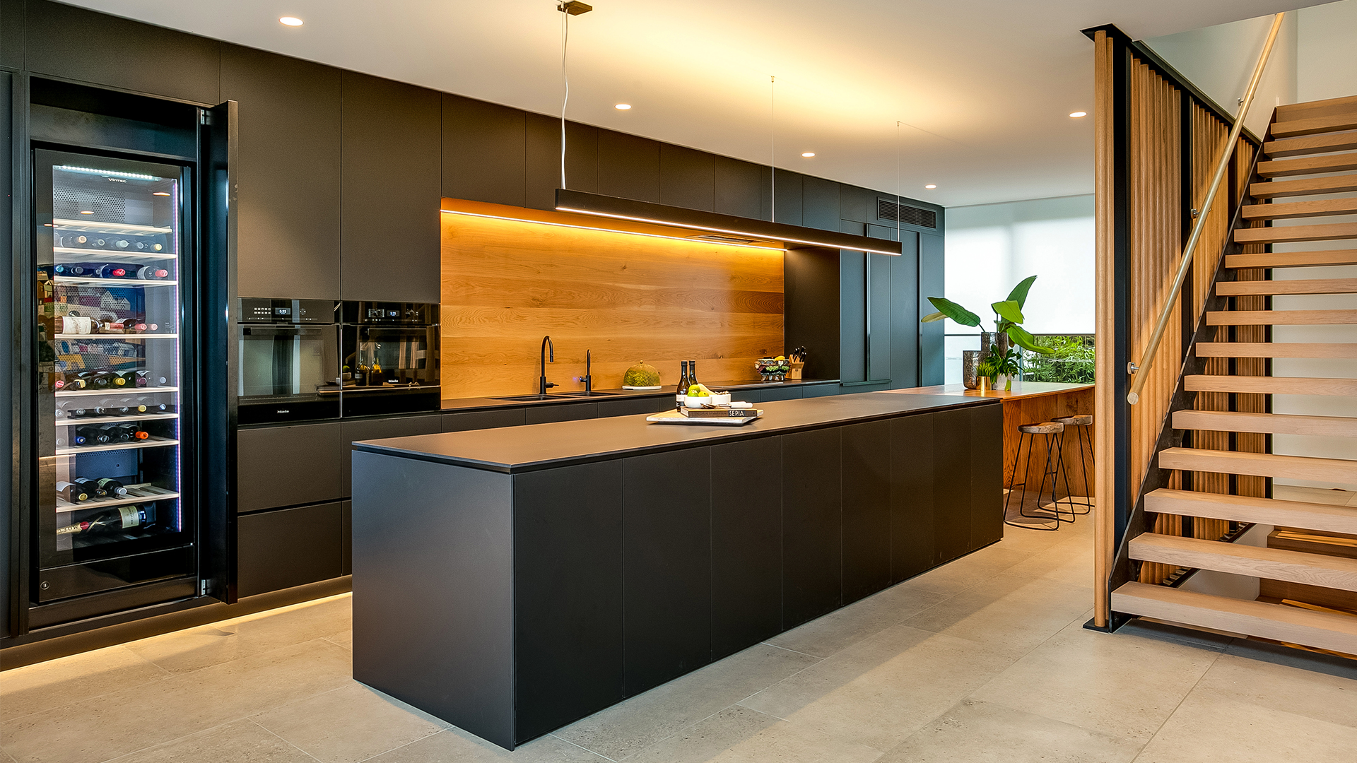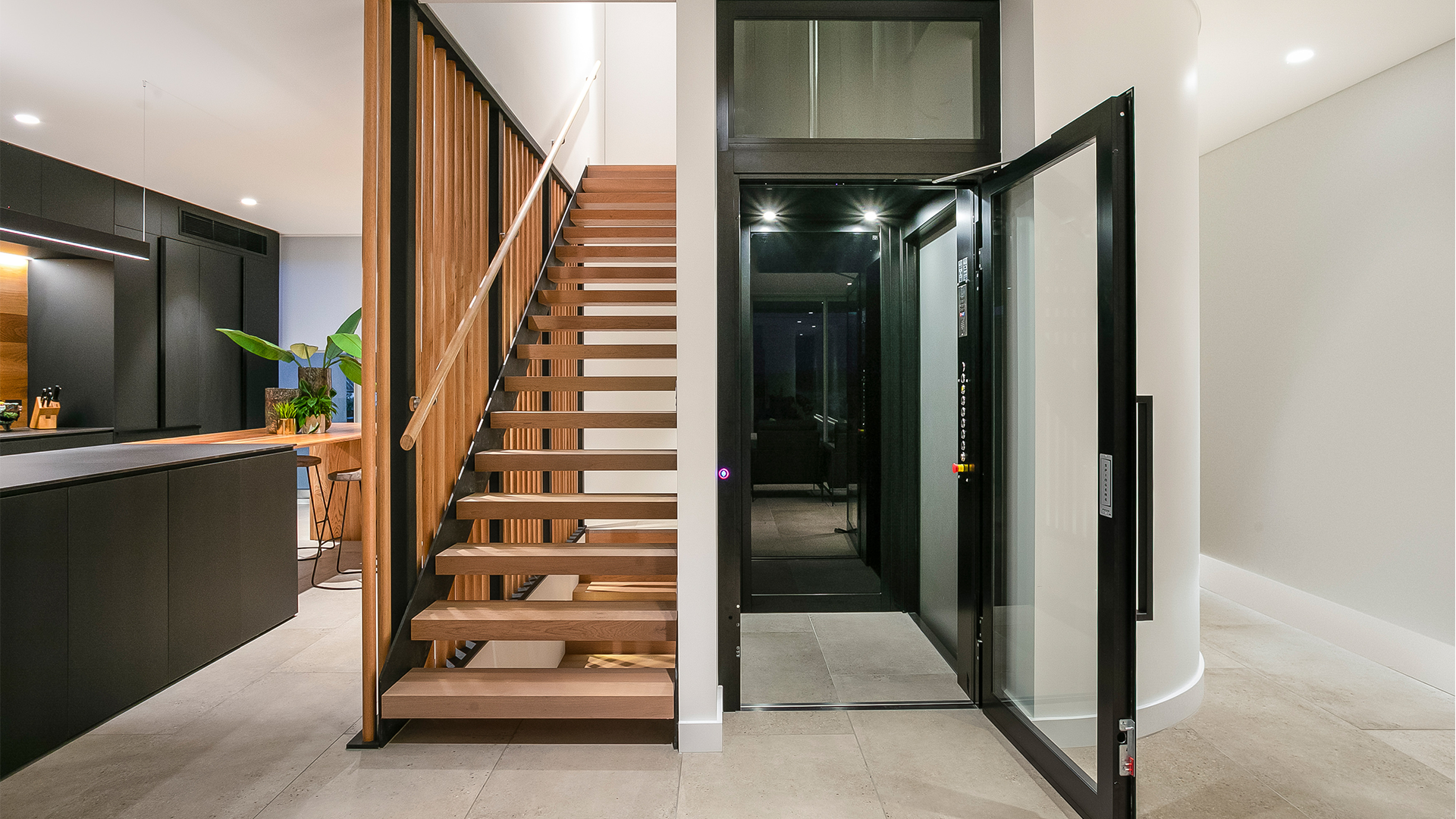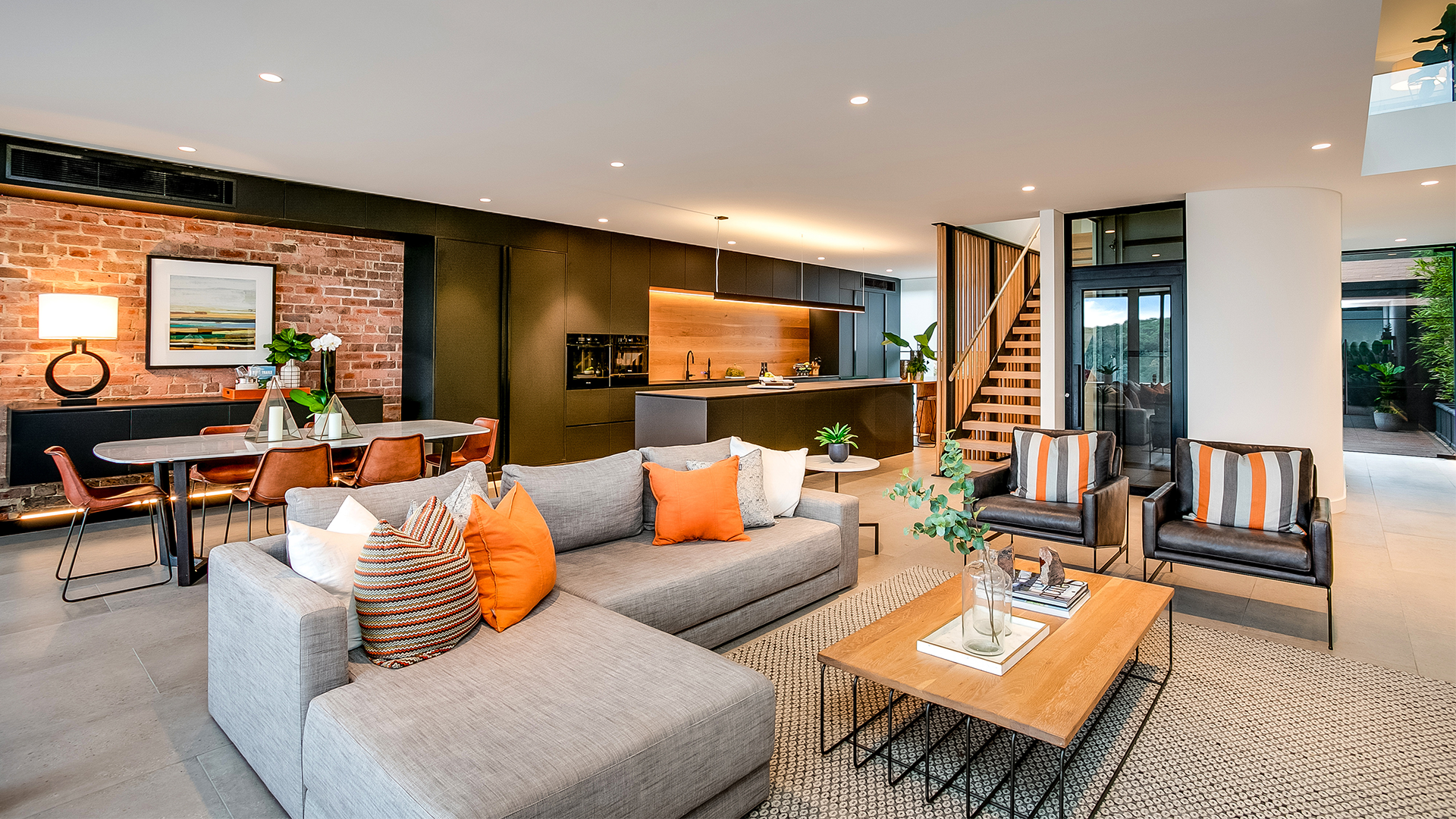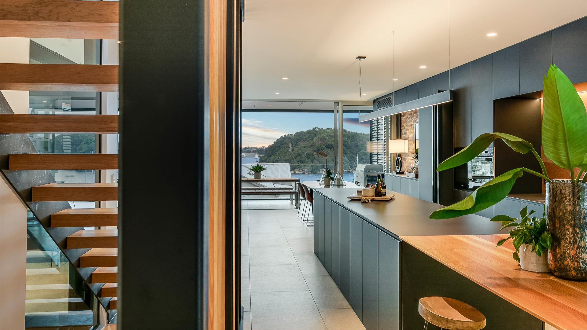 A stunning west-facing home spanning five levels has been created on a steeply sloping site overlooking Balls Head and Berrys Bay. A lift that is centrally placed allows access to each level while the discreet placement of stairs limits wasted circulation space. The top level contains a parents’ retreat complete with a stunning glass ensuite overlooking the bay. The water views are enjoyed from each level and extensive landscaped areas planted over the garage provide an accessible and level outdoor garden space.